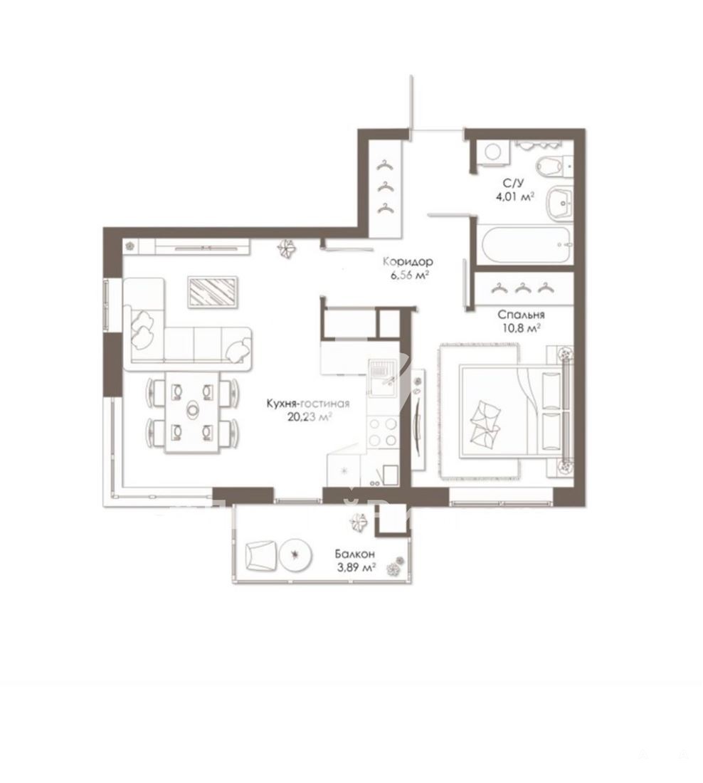 Продуманная планировка позволяет создать уют, используя каждый квадратный метр вашей квартиры. Просторная гостиная, объединенная с кухней, площадью 20 м2, позволит вам организовать комфортное пространство для отдыха и приема гостей. Из комнаты выход на балкон с панорамным остеклением. Удобная спальня с выделенной нишей для хранения вещей. Совмещенный санузел
