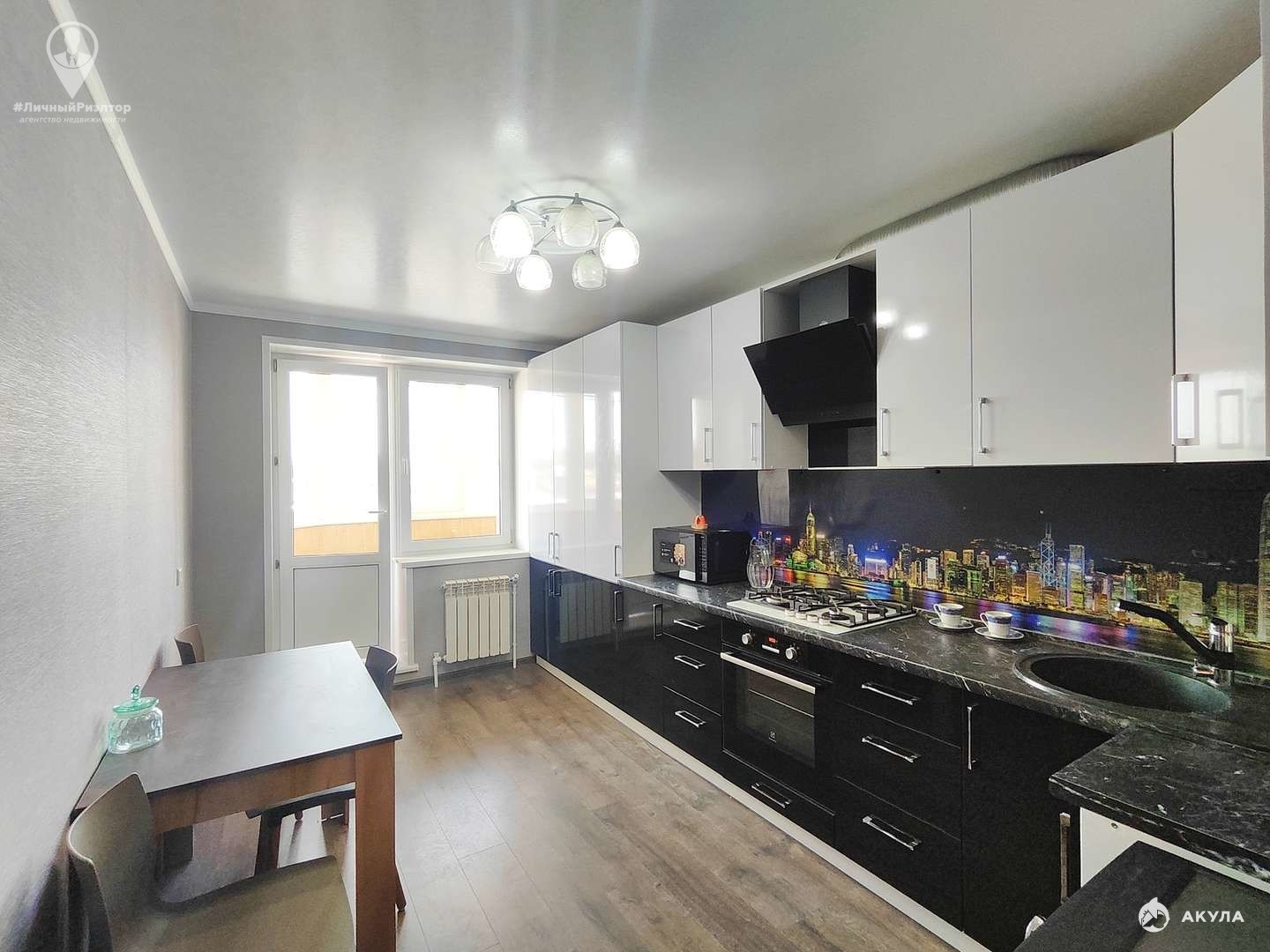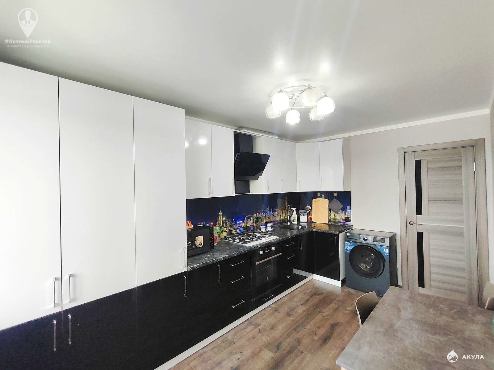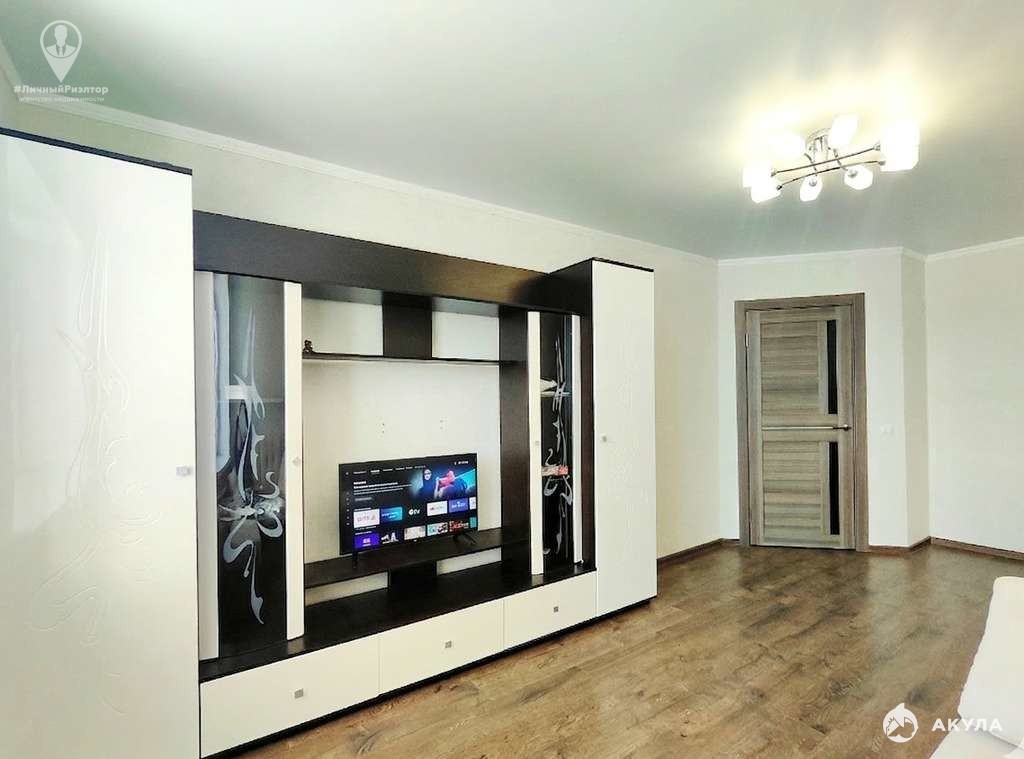 Интерьер и мебель:Кухня: Просторная, с современным гарнитуром в контрастных черно-белых тонах. Установлена качественная техника (варочная панель, духовой шкаф, вытяжка)Комната: Уютная жилая зона с мягким угловым диваном и функциональной стенкой под ТВ.