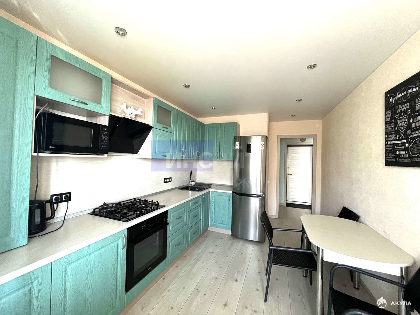 Есть вся необходимая бытовая техника: холодильник, стиральная машина, микроволновая печь, электрическая духовка, телевизор, интернет.