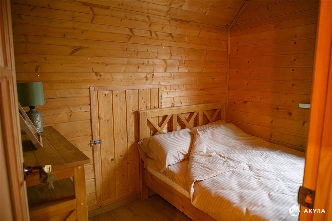 В отапливаемой бане, миникухня, столовая, парная, душ, туалет, спальня, большой зал с двумя диванами и видом на озеро. Баня также подходит для постоянного проживания.