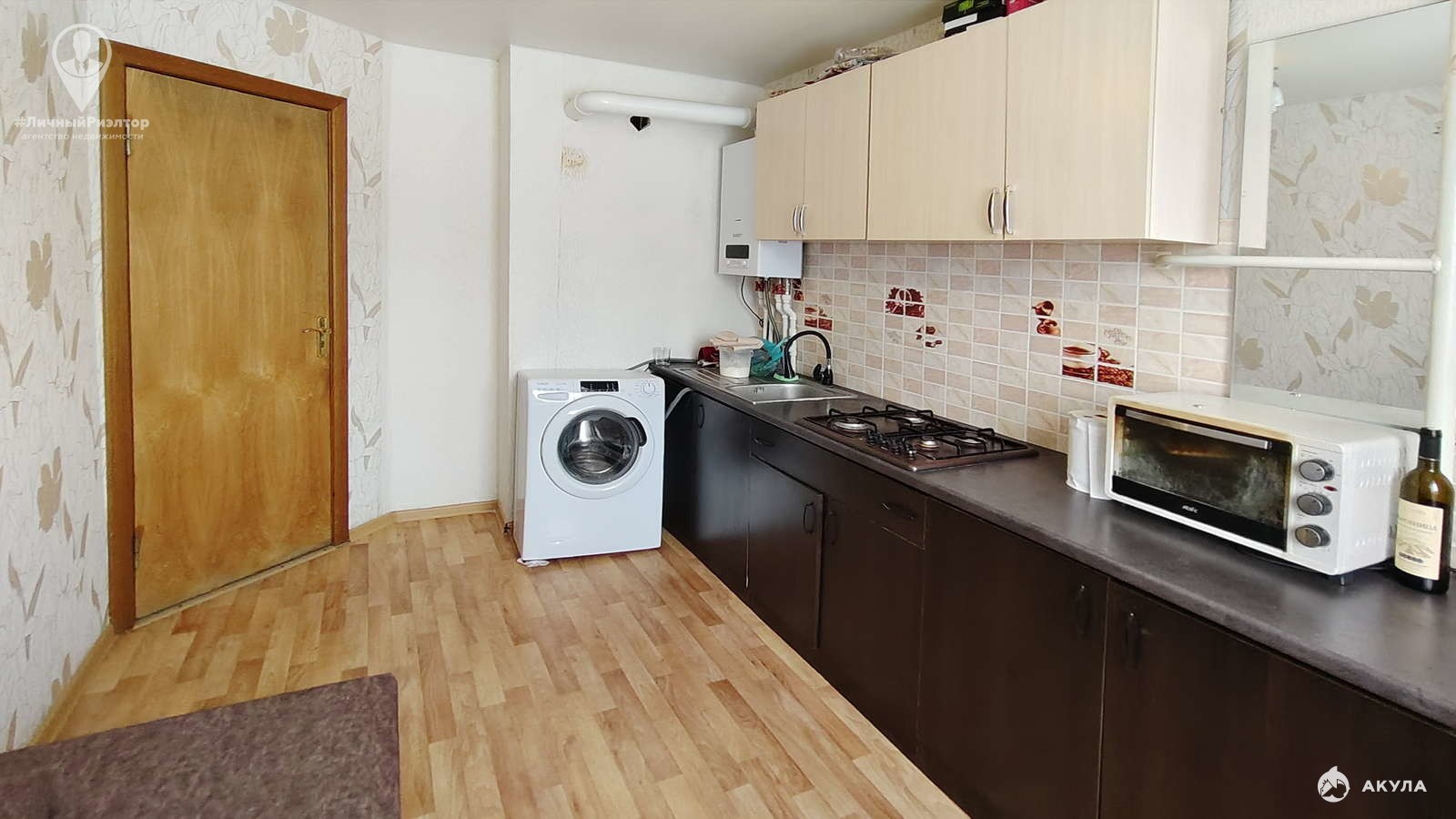 При входе в квартиру коридор с гардеробной, далее расположена большая комната с выходом на балкон, просторная кухня правильной формы с кухонным гарнитуром и техникой.